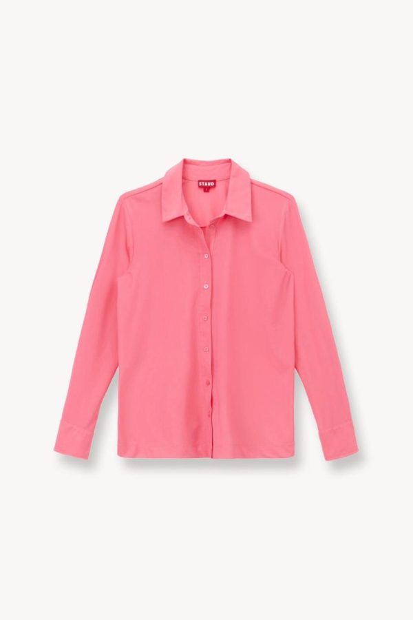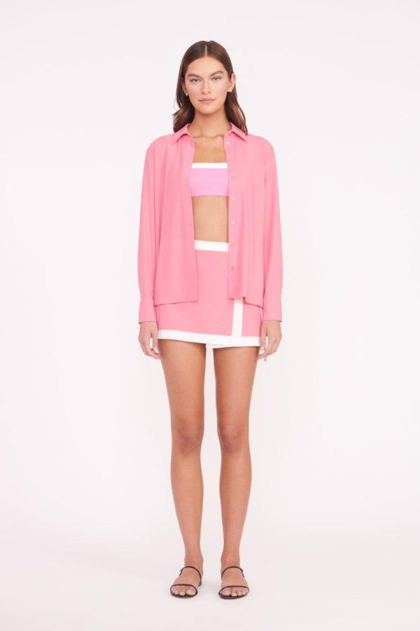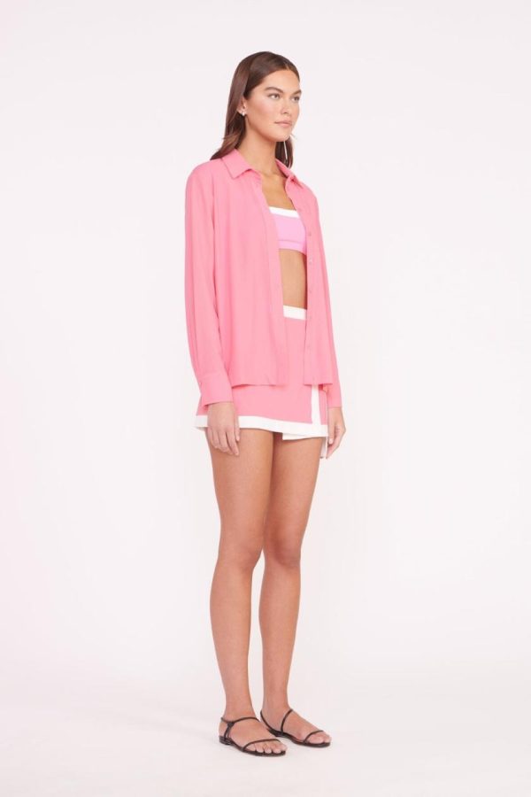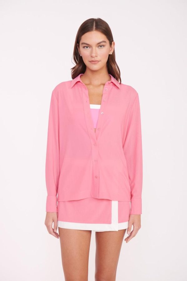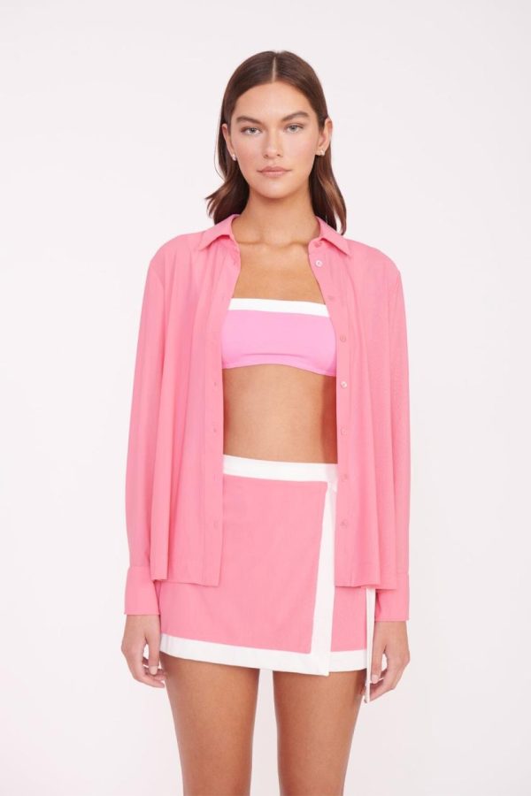 A versatile swimwear coverup fashioned after a classic button down shirt, The Miriam Top is made out of a power mesh fabric.