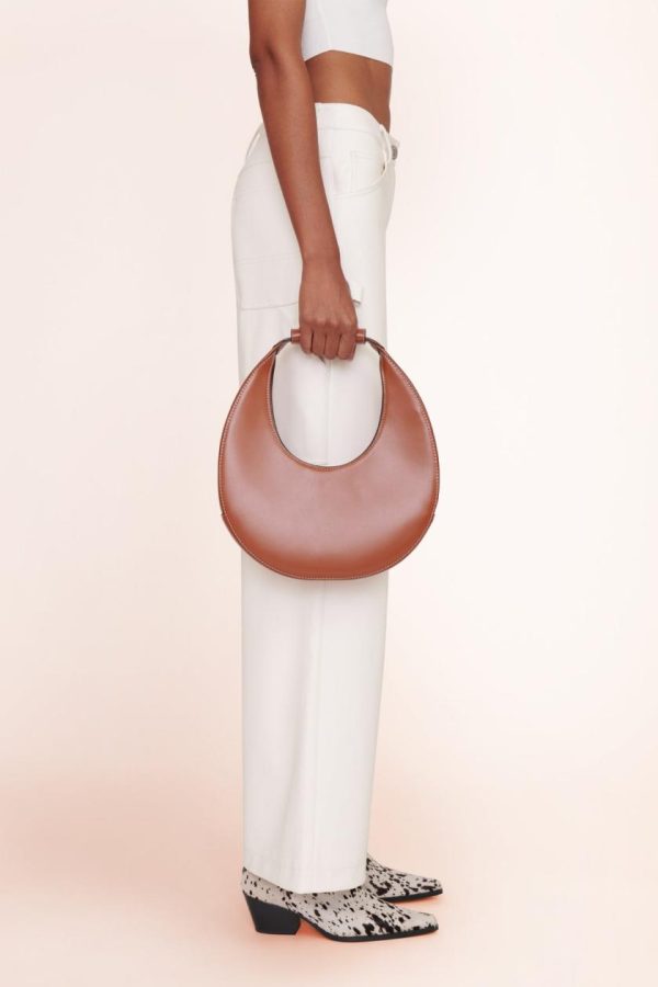 The Moon Bag is a crescent moon shaped tote with a curved handle with removable STAUD-embossed accent. This style features an inner suede lining and a magnetic clasp closure to hold your essentials.