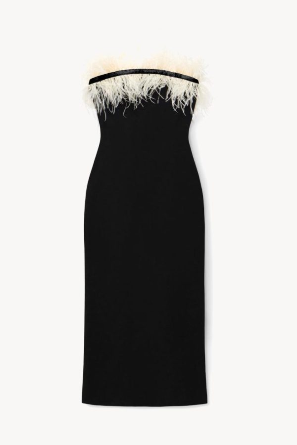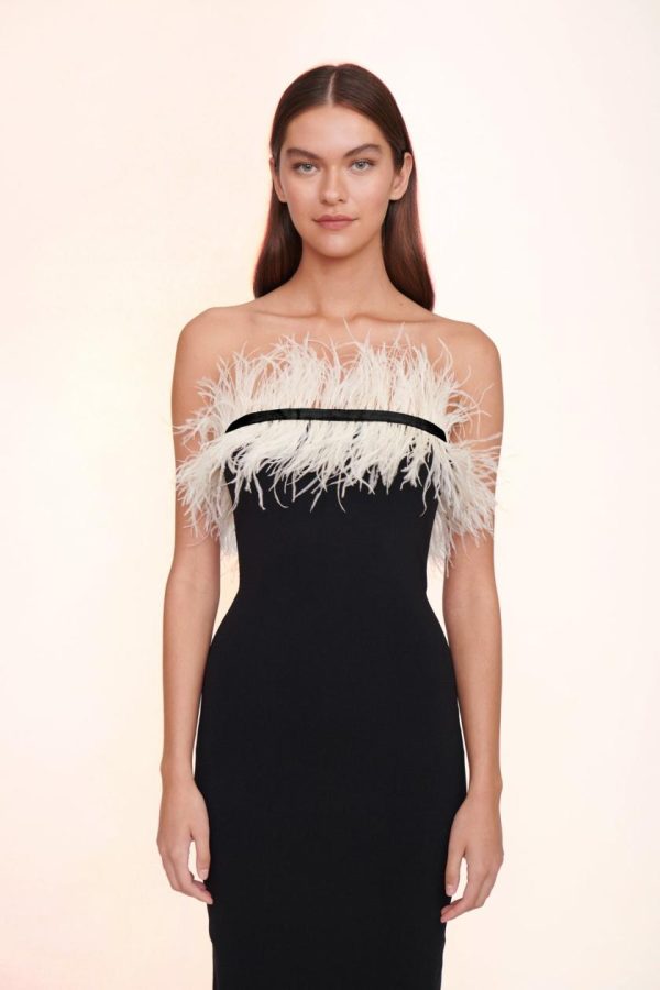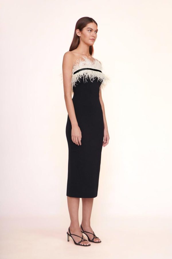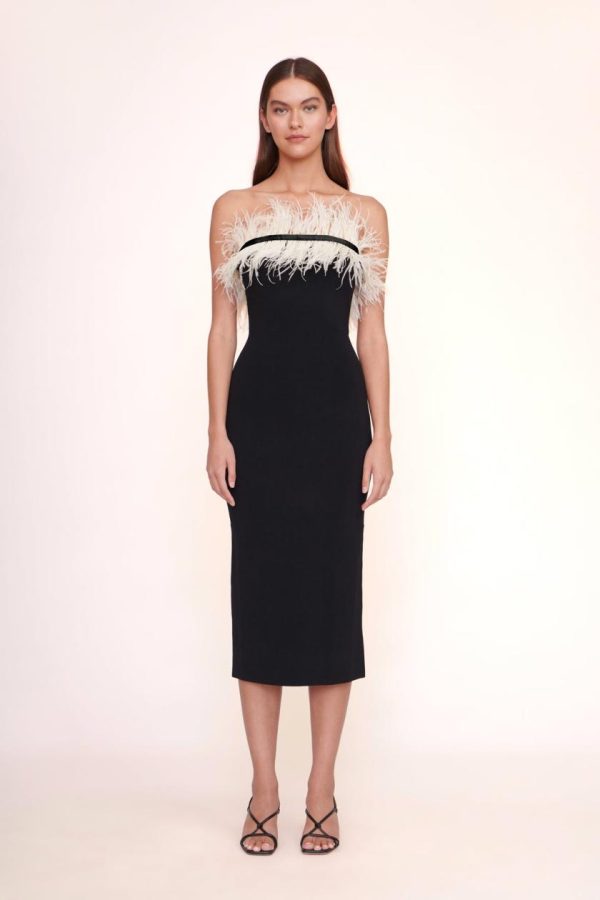 The Nellie Dress is a compact knit fitted midi length dress with ostrich feathers along the bust.