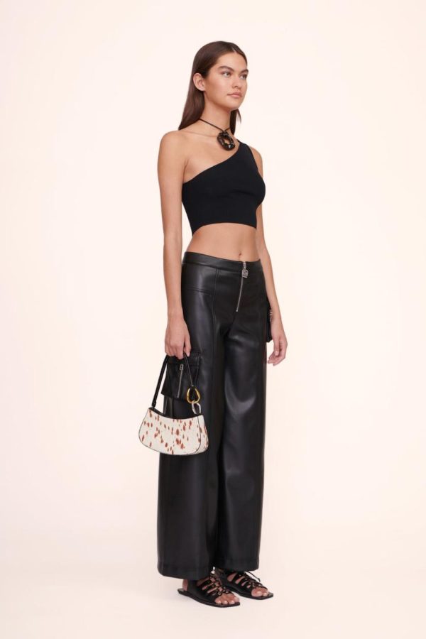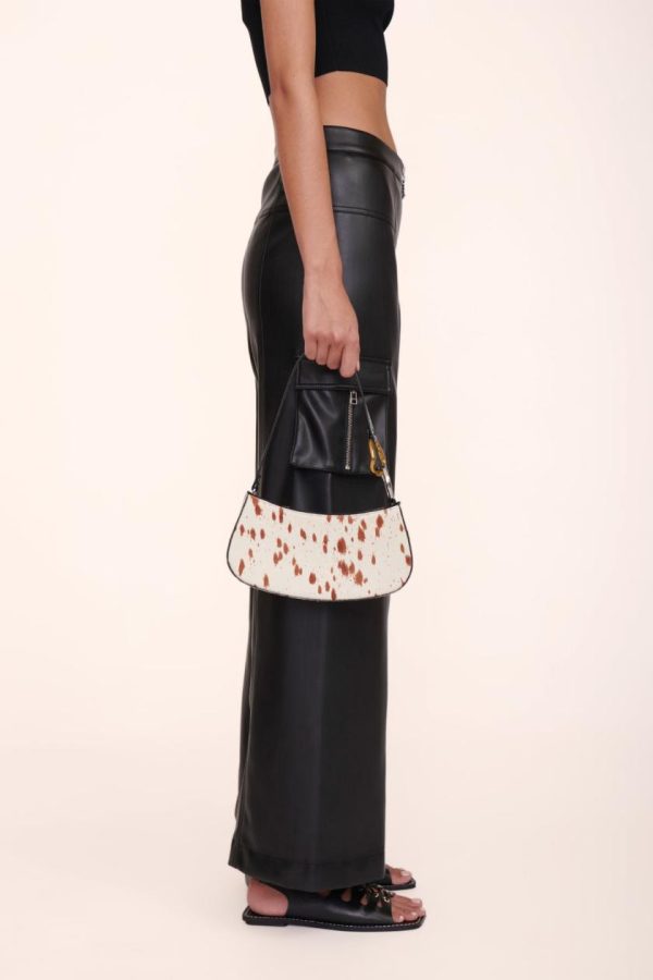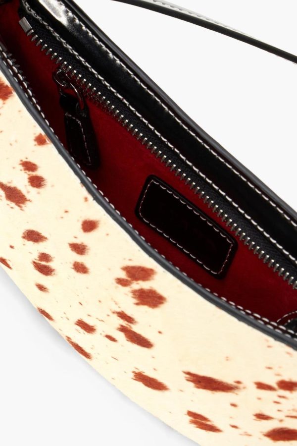The Ollie Bag is a mini shoulder bag made out of haircalf. This style features a hardware design on the strap and a zip closure.