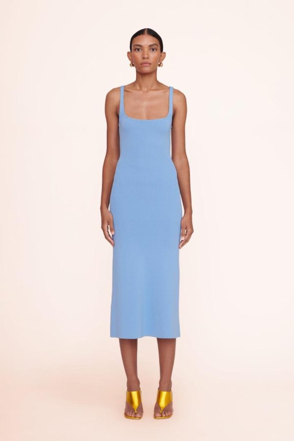 A fitted sleeveless dress made out of compact knit fabric. This style features a wide square neckline and midi length.