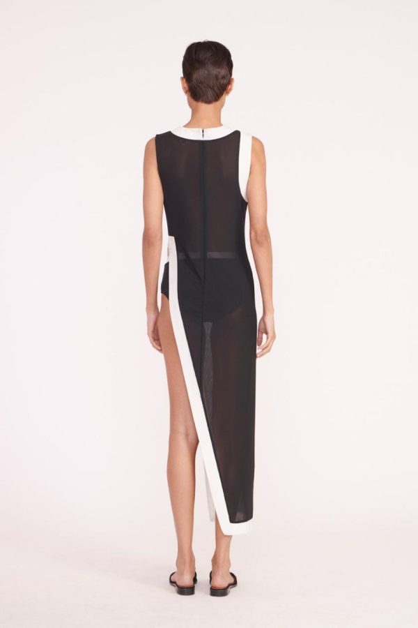 An asymmetrical coverup top, the Pointer is constructed out of a mesh fabric and features contrast trim details.