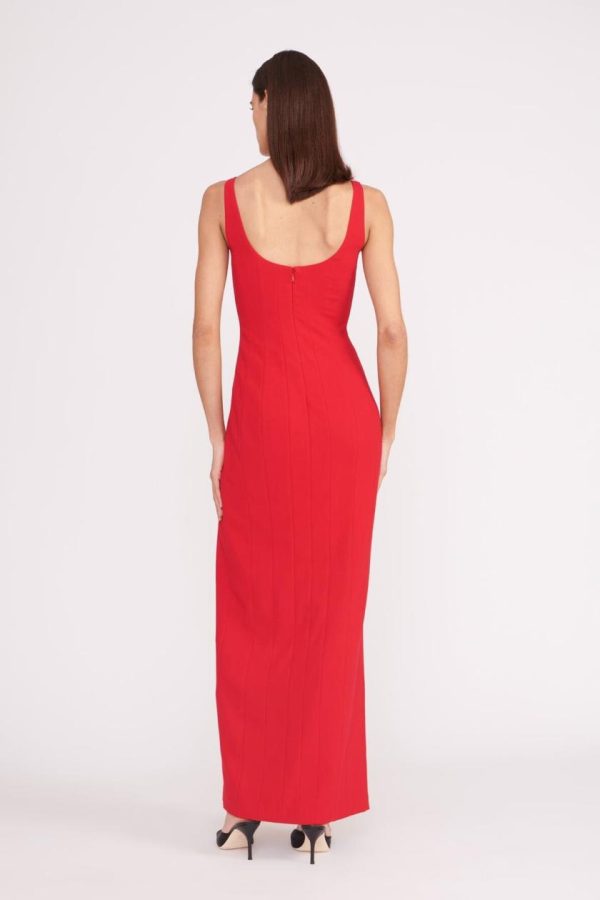 Updated in a slightly stretchy fabric, the Portrait Dress is our signature column dress. This style features a thigh high slit and bodice seaming.