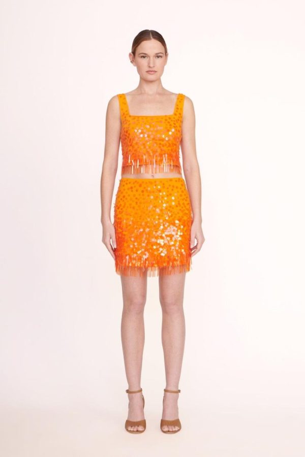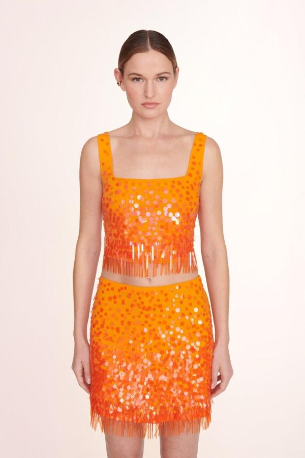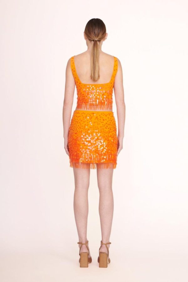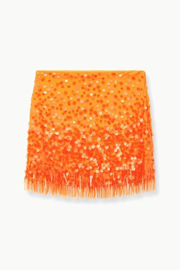 The Rebecca Skirt is an all-over embellished paillette mini skirt with paillette fringe at the hem. This style features a hidden side zipper and makes a matching set with the Jasmin Top.