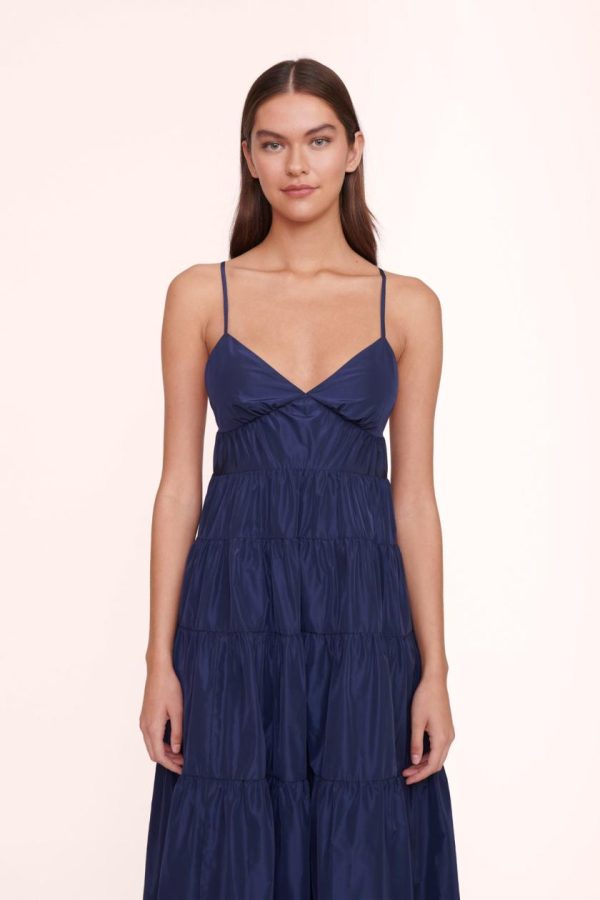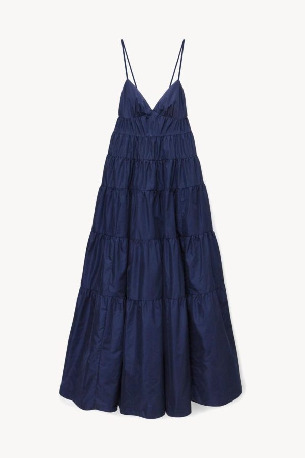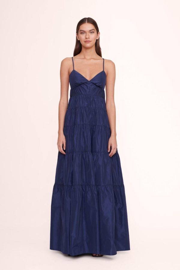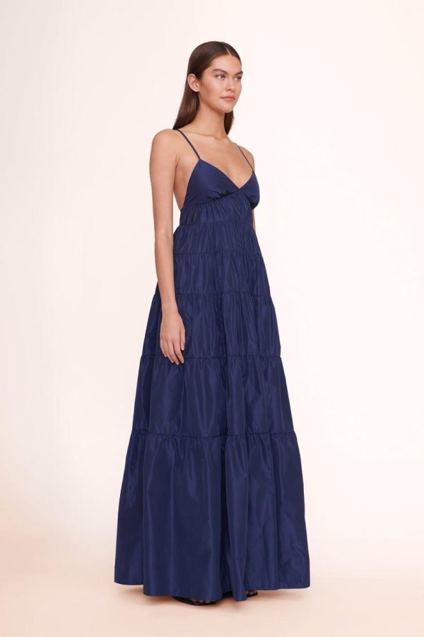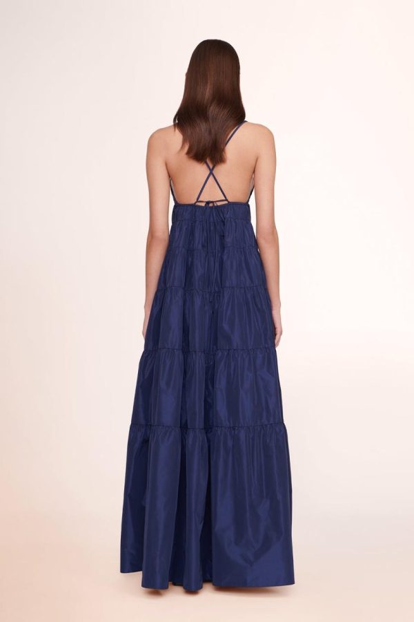 A sleeveless tiered gown, the Ripley Dress features a v-neckline and is made out of a tech taffeta fabric. This style offers adjustable straps and a voluminous skirt.