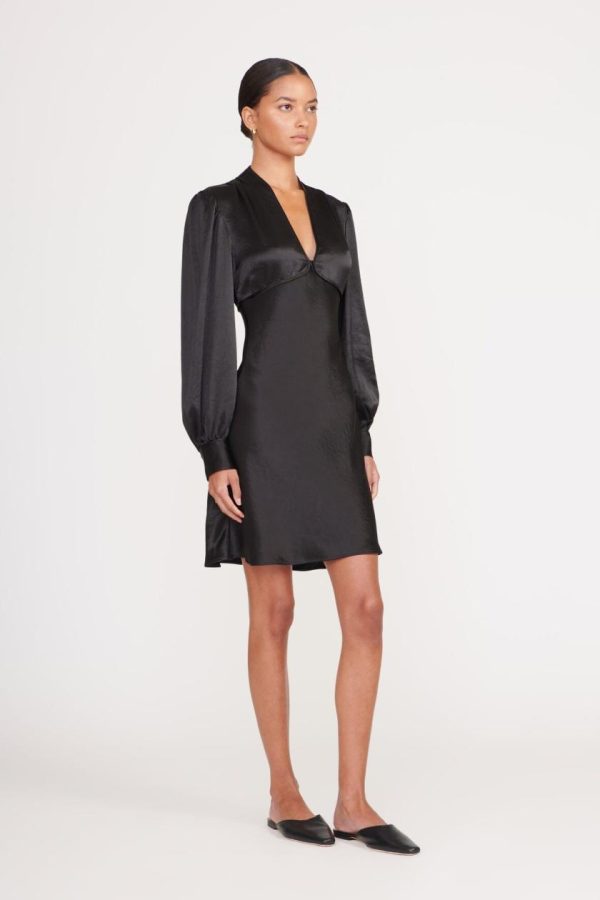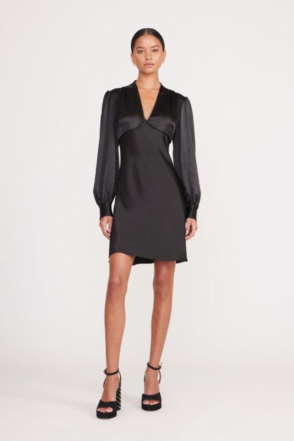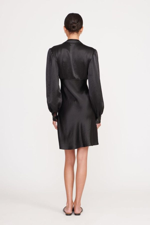 The Rosenda Dress is a satin bias cut mini dress with curved seams at the chest. This style has a fitted bodice and full sleeves with cuffs.
