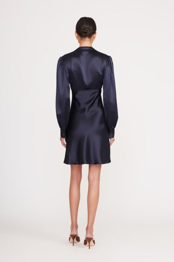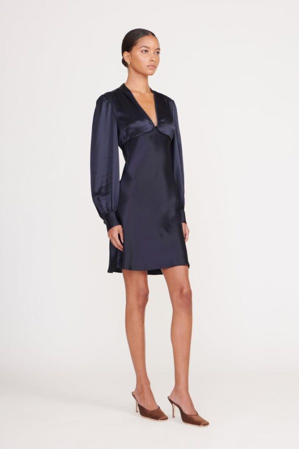 The Rosenda Dress is a satin bias cut mini dress with curved seams at the chest. This style has a fitted bodice and full sleeves with cuffs.