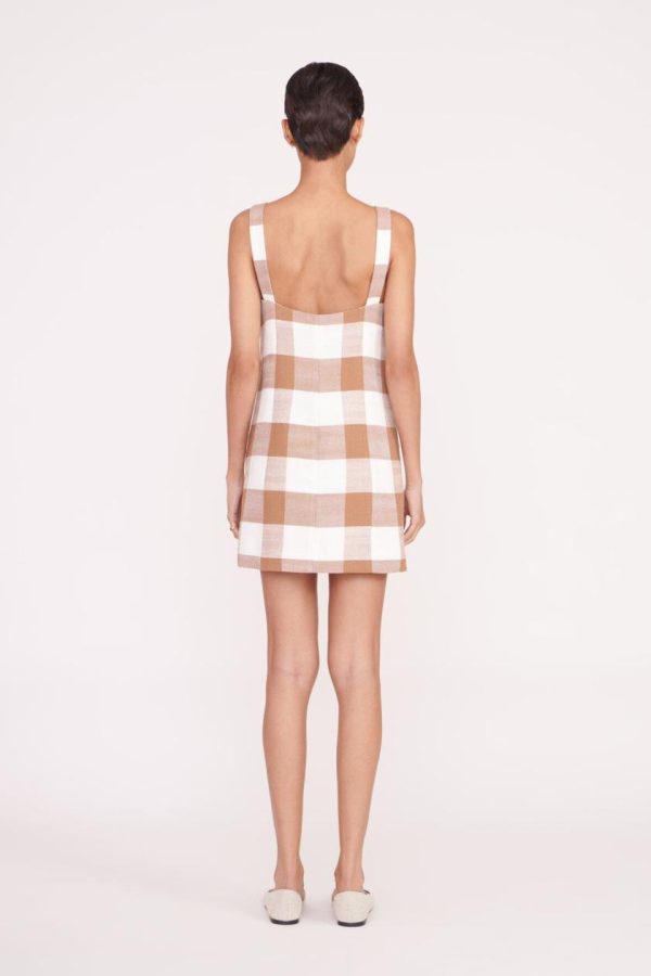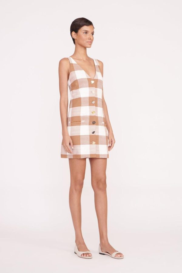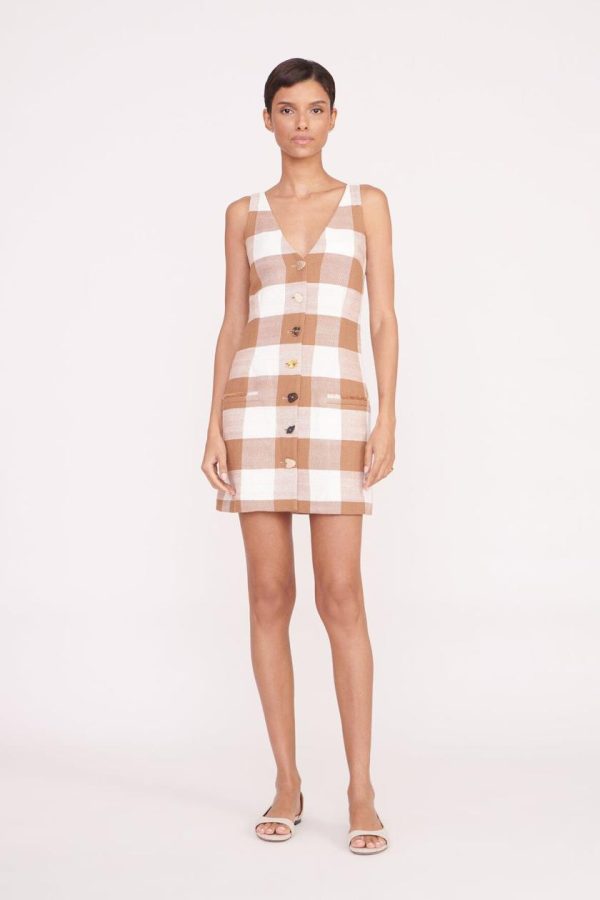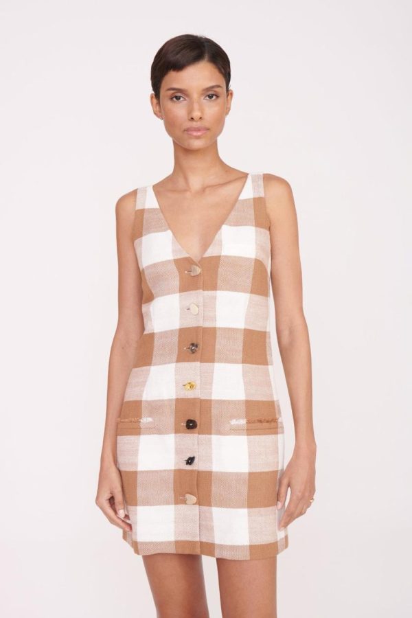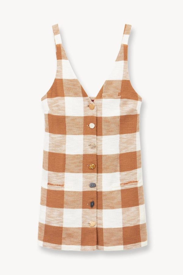 A sleeveless mini dress with mismatched buttons, the Samuel is constructed out of a structured cotton gingham suiting fabric. This style offers a boxy fit, v-neckline and two front pockets.
