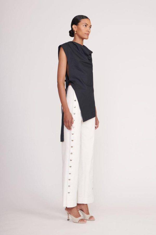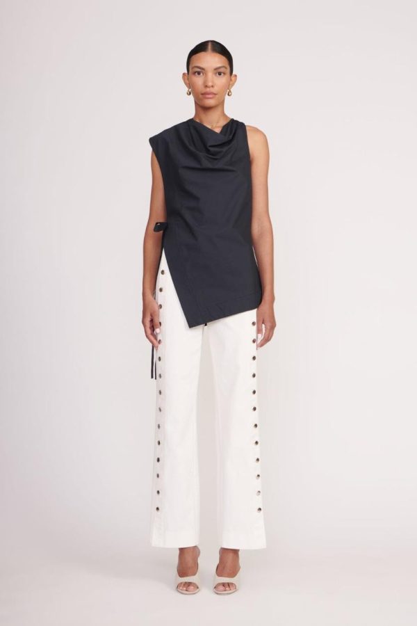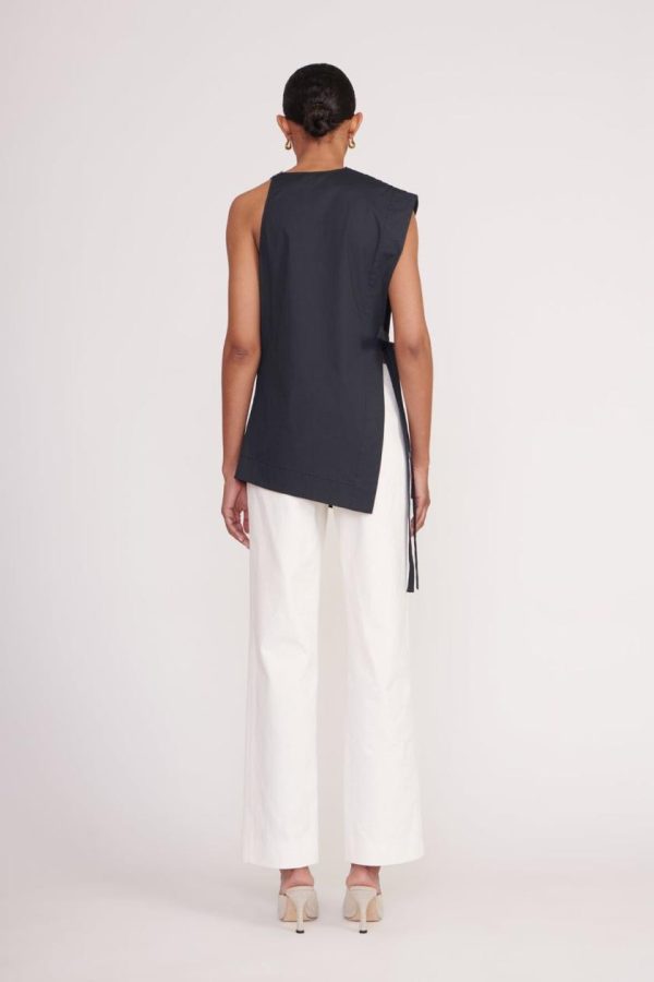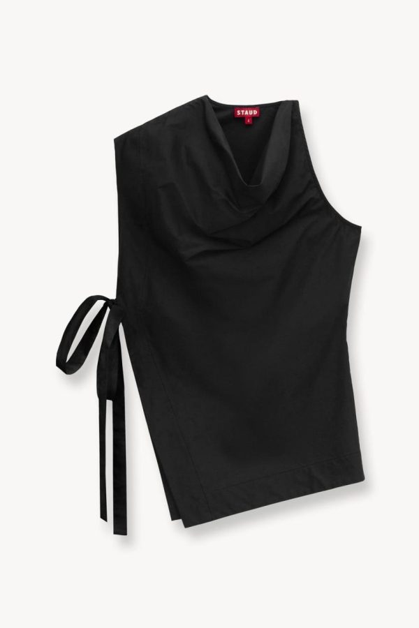 An asymmetrical sleeveless top made out of a stretchy cotton poplin fabric. The Sawyer features a cowl neckline and waist tie at the right side.