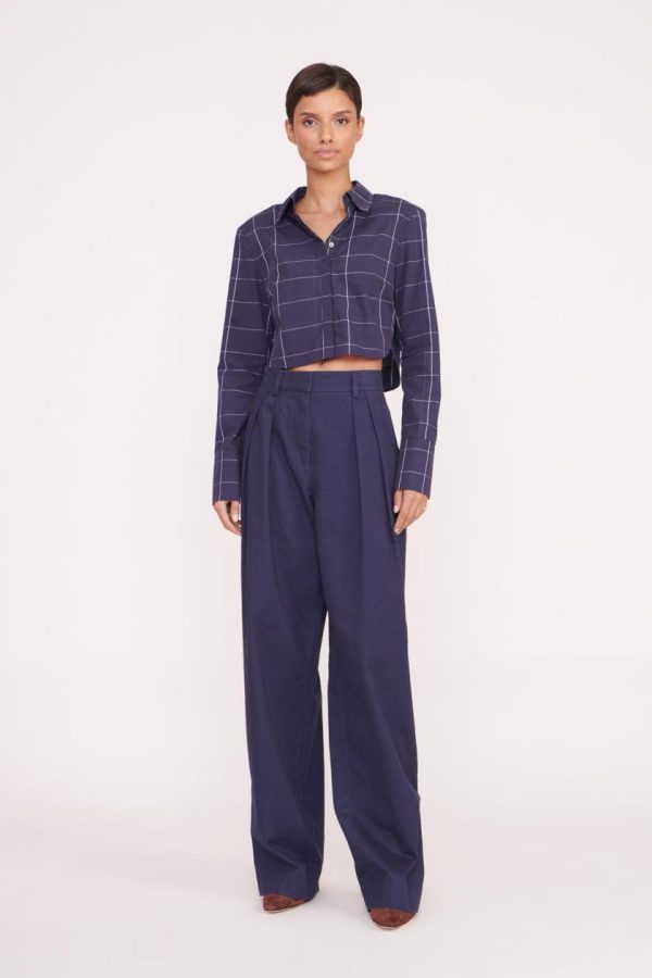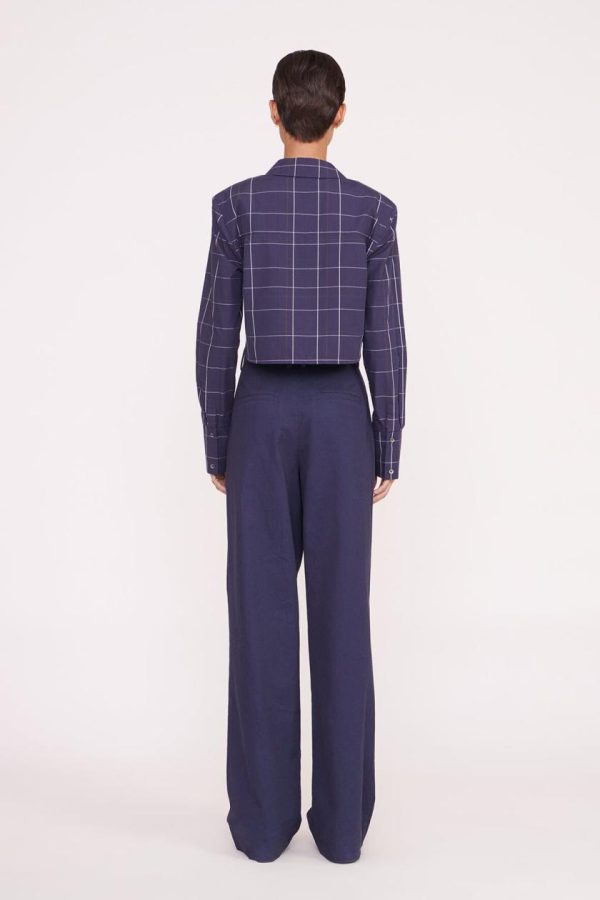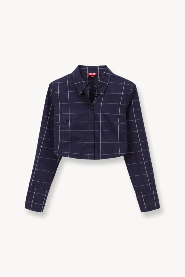 A cropped button down shirt, the Seneca Top is made out of a crisp cotton poplin fabric. This style features tall cuffs, a rounded hem and shoulder pads.