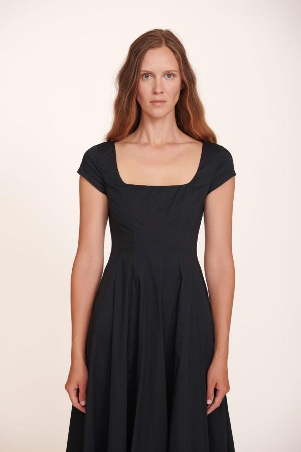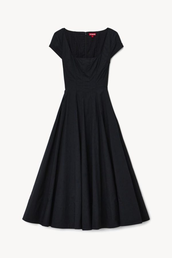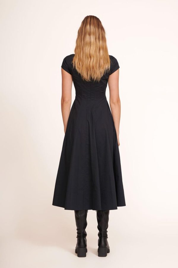 Our classic midi poplin dress in a short sleeve update. This style is fashioned after the STAUD signature Wells Dress and features the same corset-style panel construction and a-line skirt.