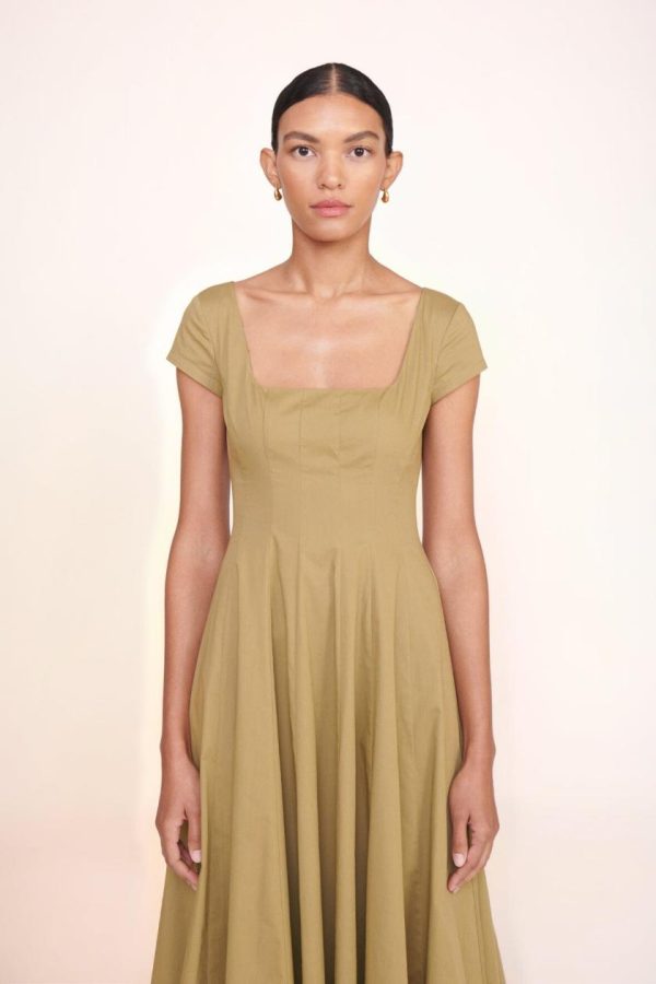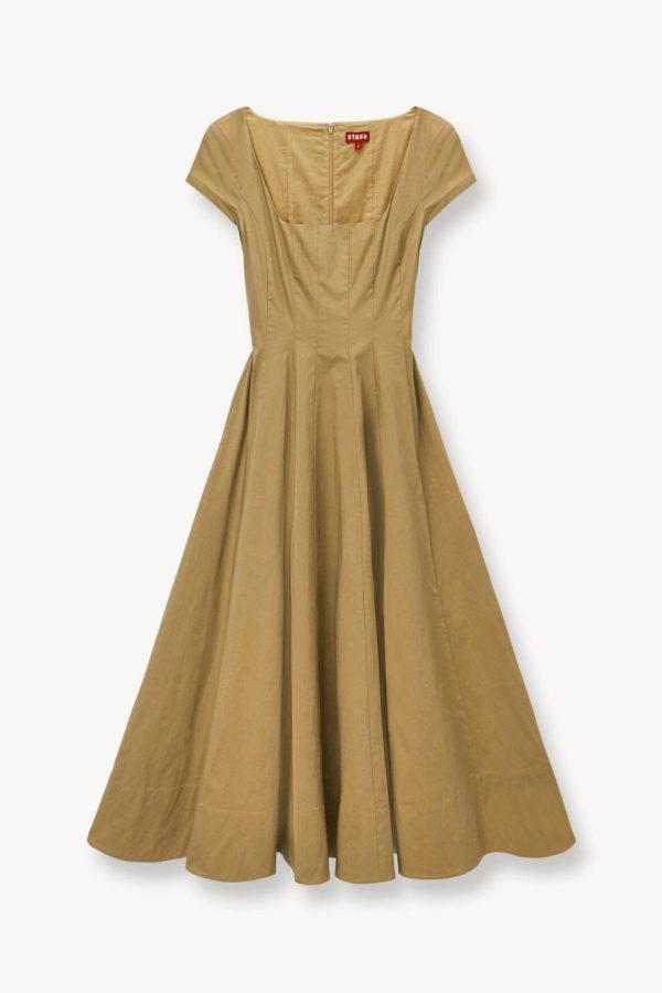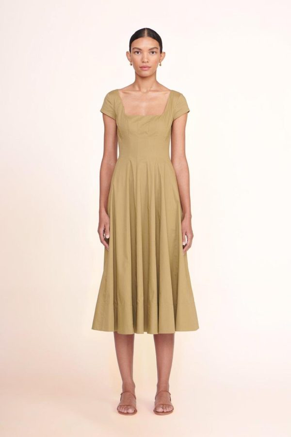 Our classic midi poplin dress in a short sleeve update. This style is fashioned after the STAUD signature Wells Dress and features the same corset-style panel construction and a-line skirt.