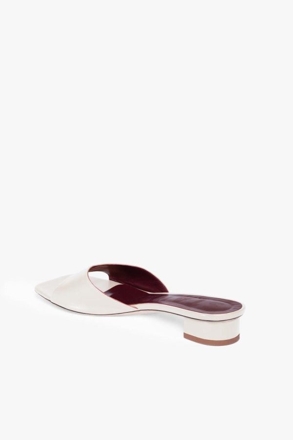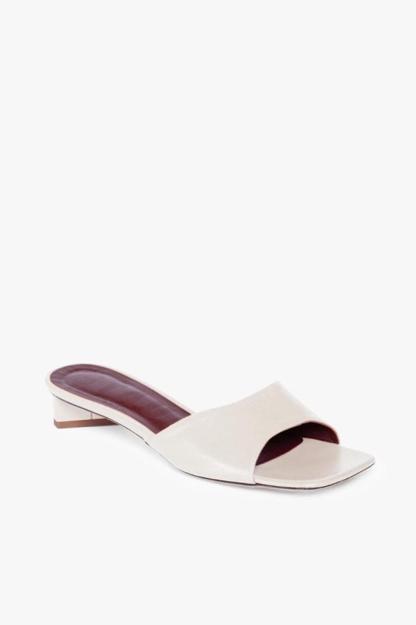 The Simone Mule is an open, square-toed mule with an asymmetrical block heel.