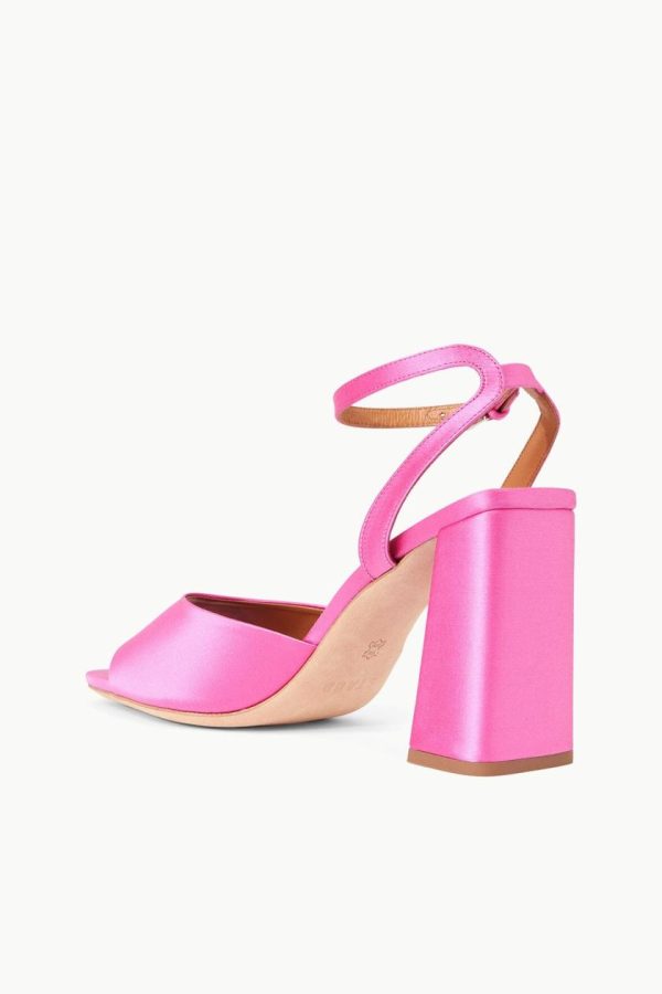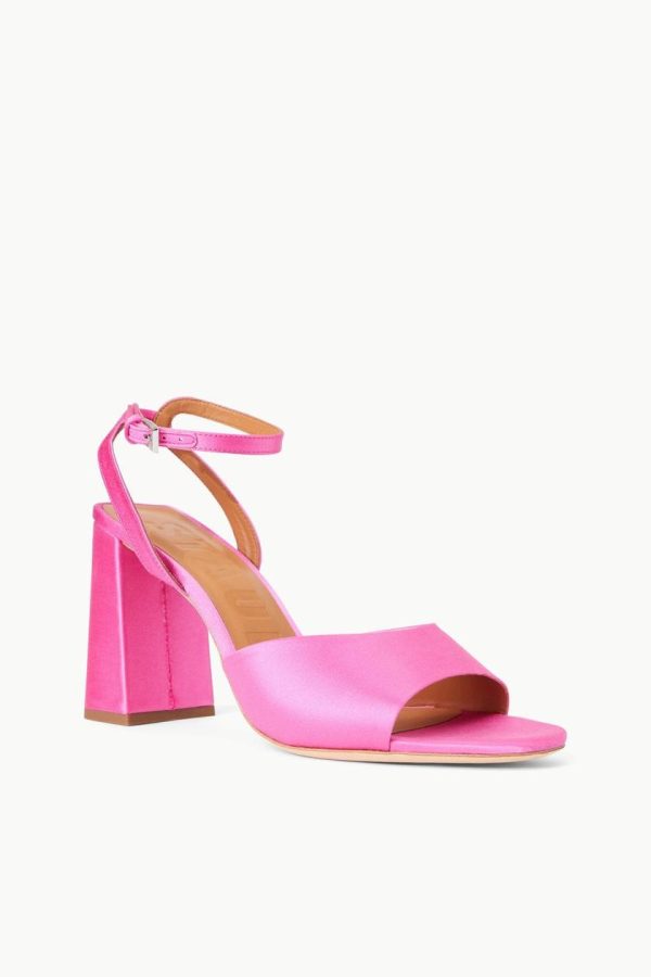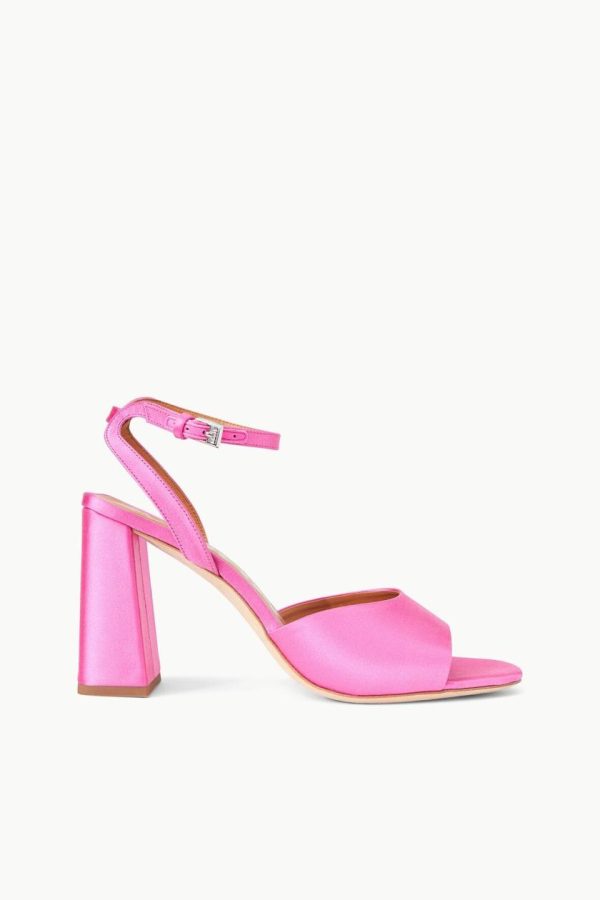 An open toe heel with ankle strap and buckle closure, this style is made out of a satin fabric.