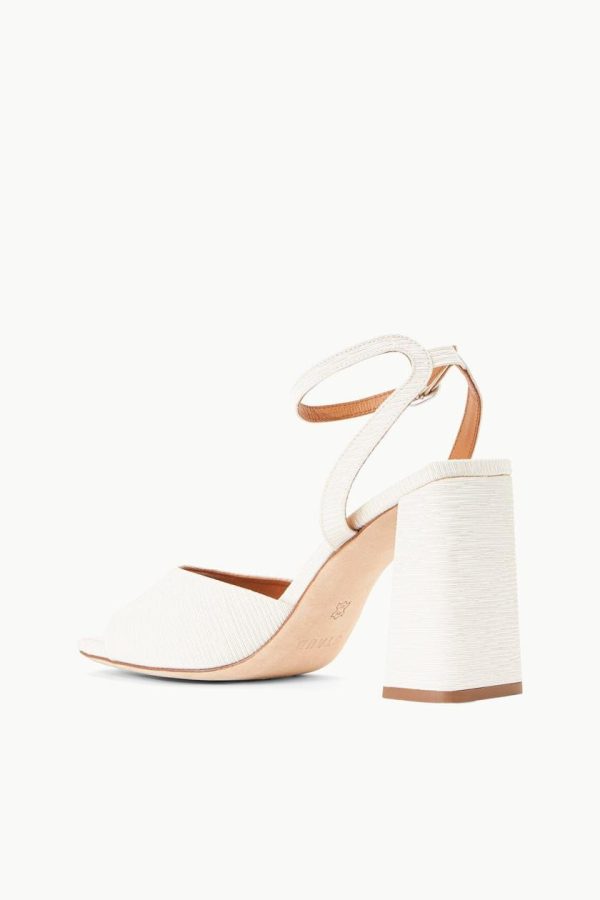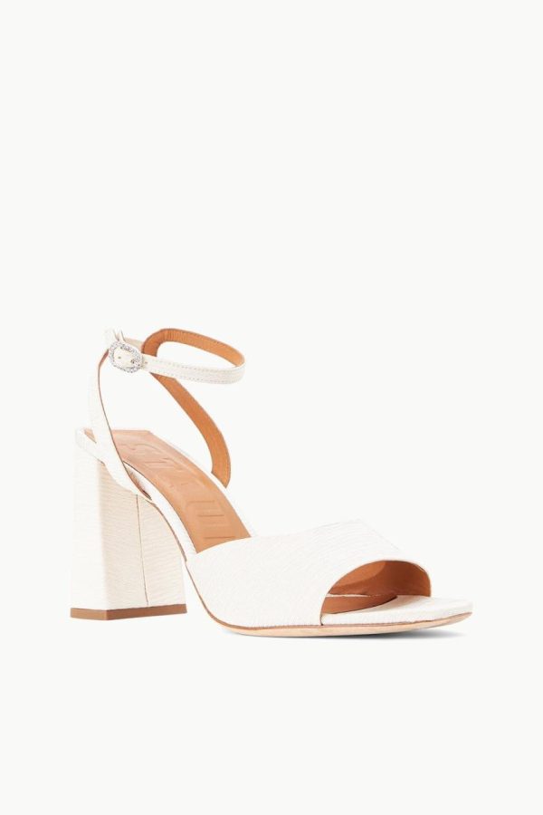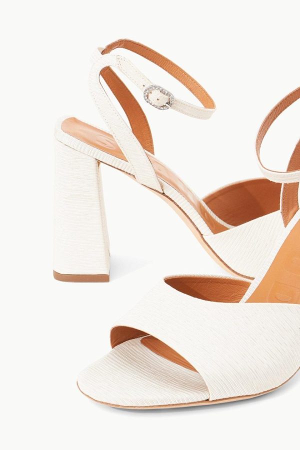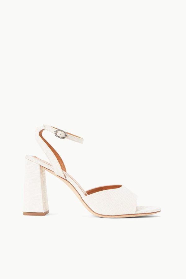 An open toe heel with ankle strap and rhinestone buckle closure, this style is made out of a grosgrain fabric.