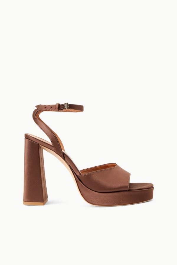Updated for the season with a platform, the Solange is an open toe heel with ankle strap and buckle closure made out of satin.
