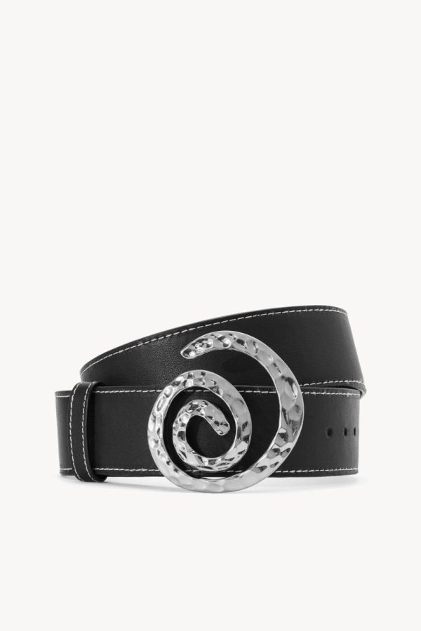 A 45mm leather belt with contrast top stitch. This style features a hammered prong buckle with swirl motif that matches our ready to wear collection.