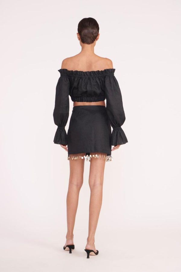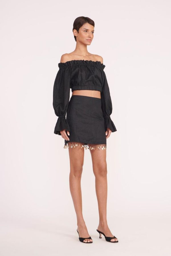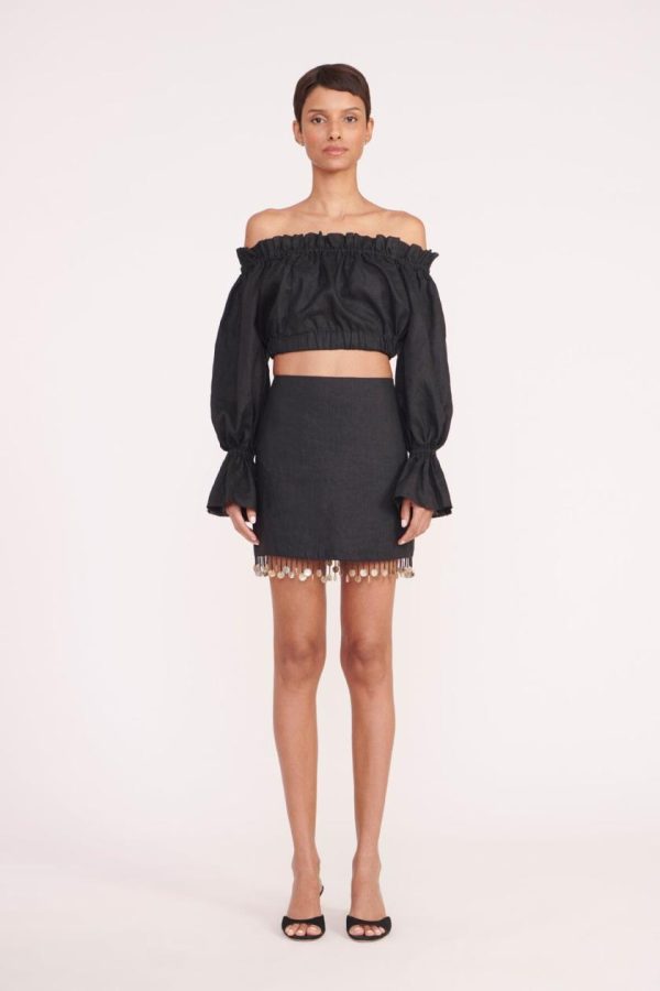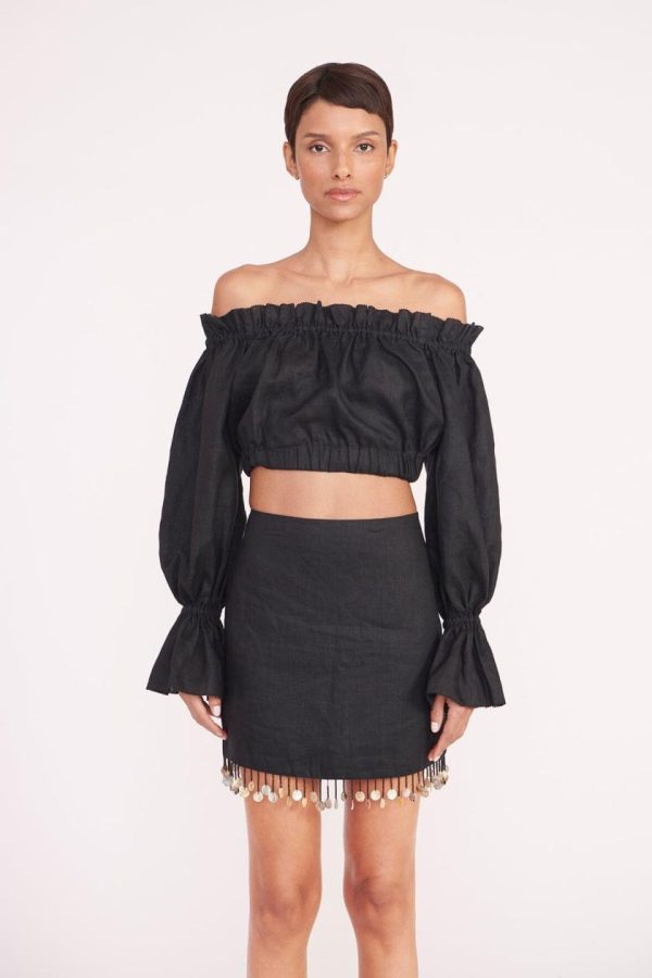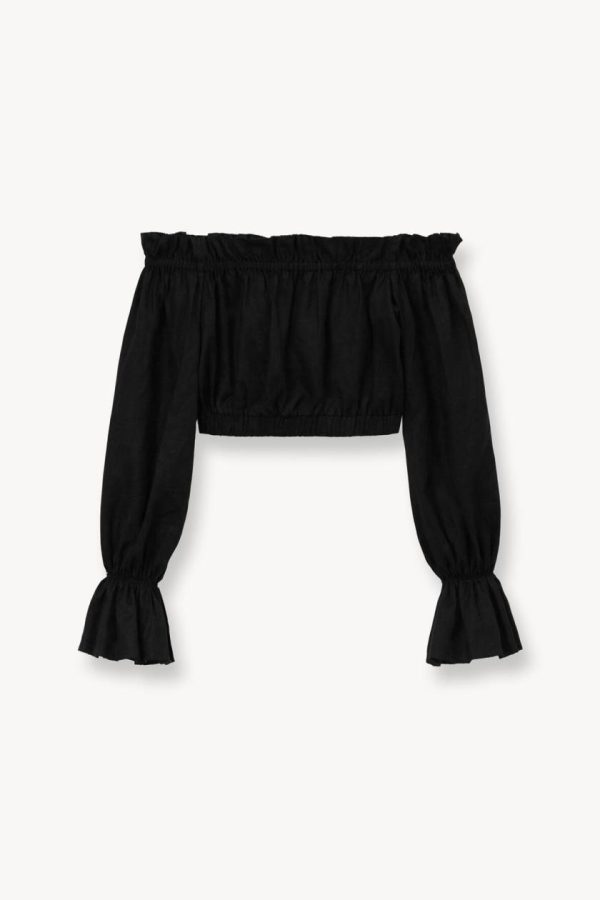 The Tristan Top is a cropped linen top, perfect for your Summer wardrobe. This top features an off the shoulder neckline, with ruffles at the neckline and cuff, with an elastic hem.