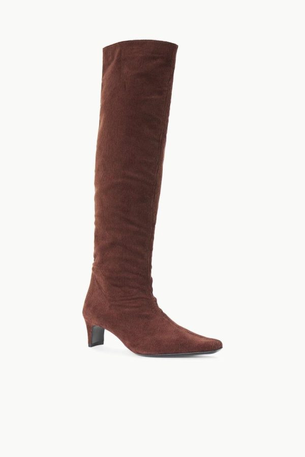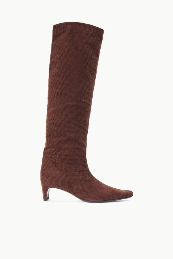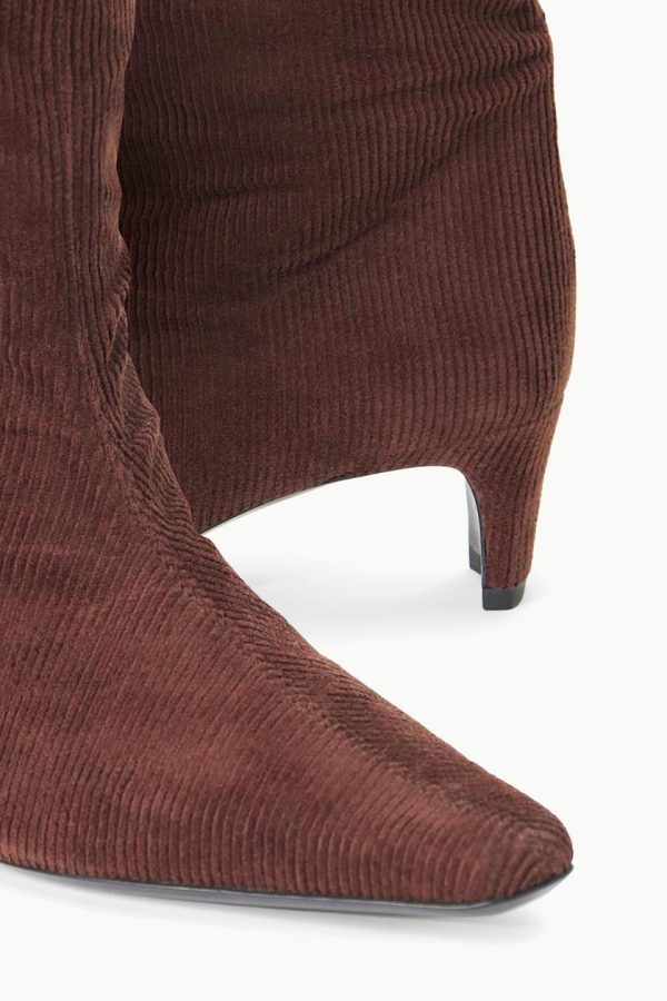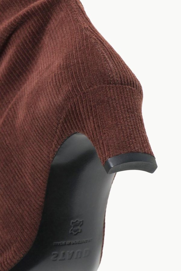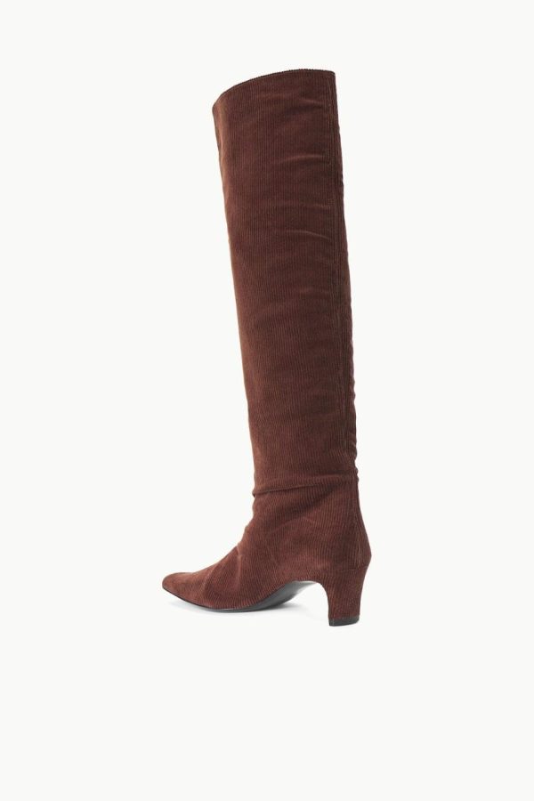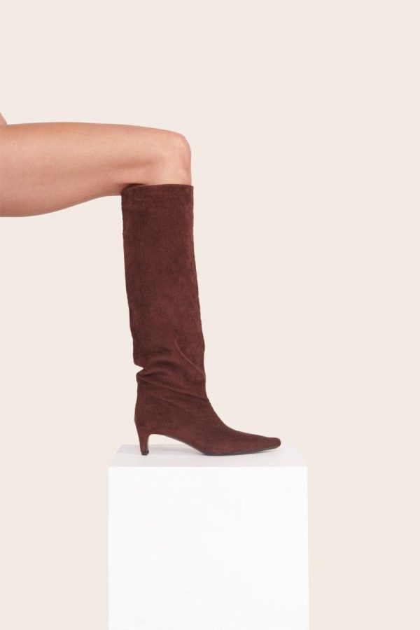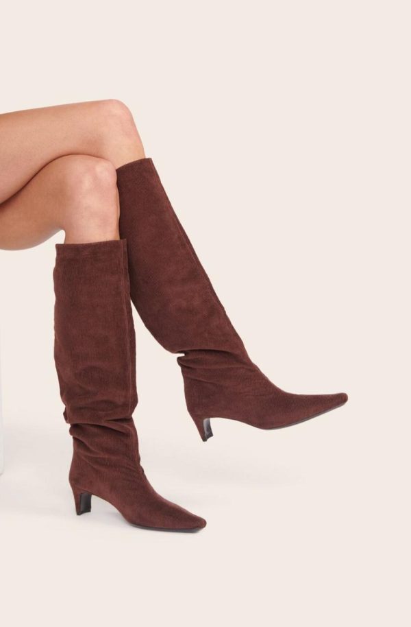 The Wally is a scrunched corduroy knee-high boot featuring a pointed toe and a slim heel design.