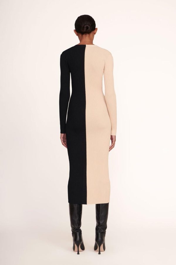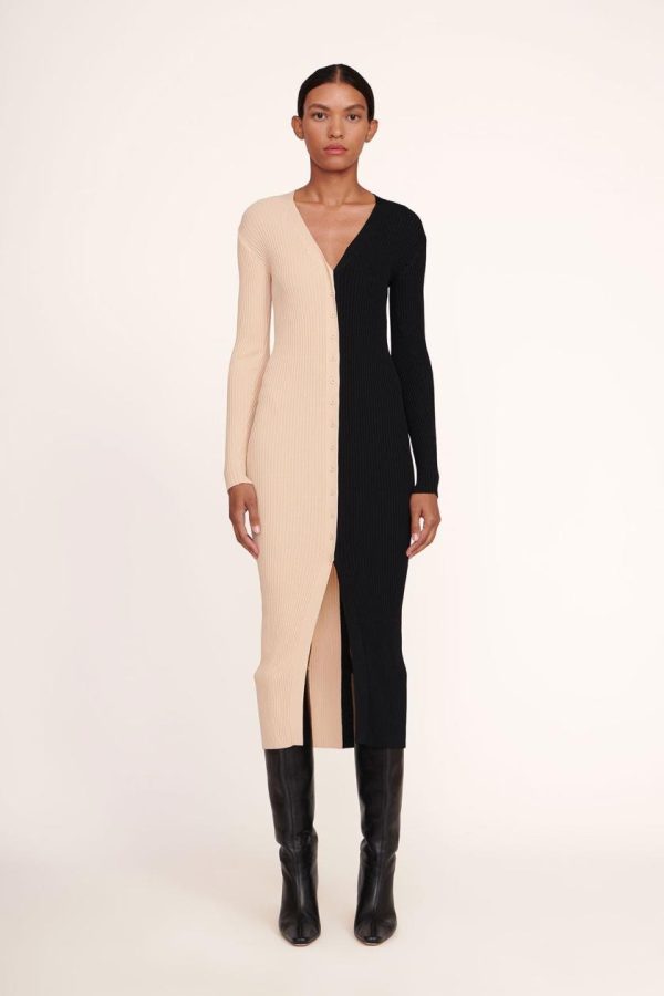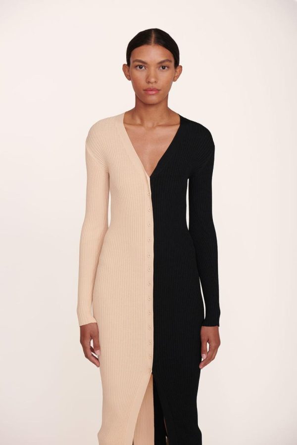 Discover the ultimate versatility with our signature Shoko Sweater, expertly crafted to transition seamlessly from a cozy cardigan to an elegant dress. This sophisticated two-tone design features a stretchy, comfortable compact rib knit that moves with you throughout your day.
