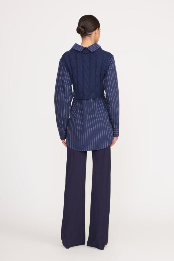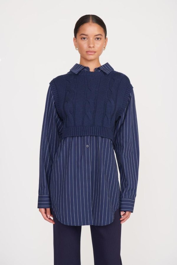 Experience effortless sophistication with our layered poplin and knit long-sleeve top, featuring a chic cable knit vest elegantly layered over a crisp poplin button-up shirt. This innovative design delivers the polished look of multiple pieces with the convenience of a single garment.